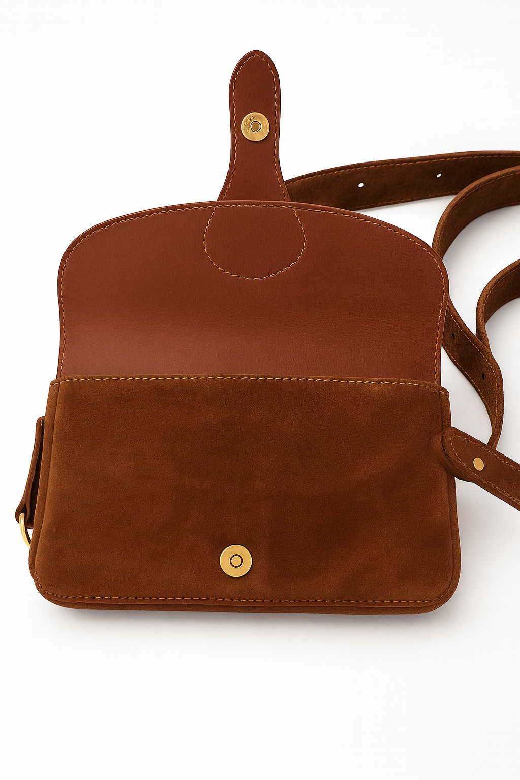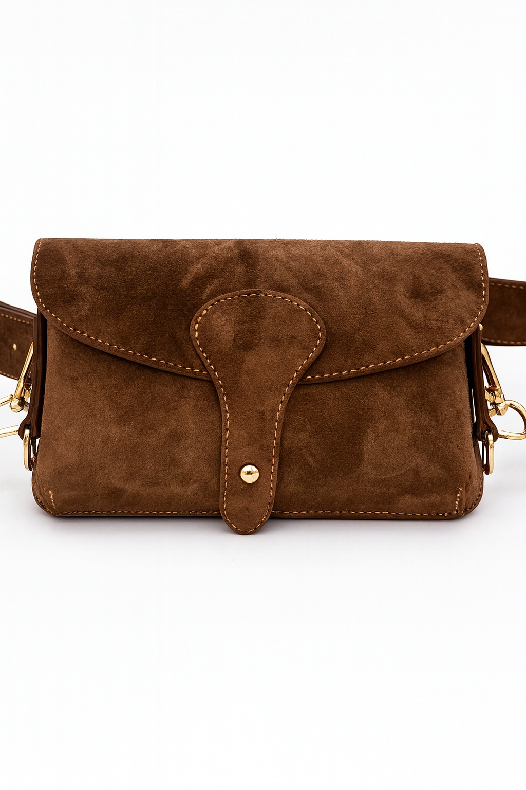 Model wyróżnia się klapą o zaokrąglonym kształcie z eleganckim paskiem zapinanym na zatrzask, a delikatne złote okucia dodają całości klasy i subtelnego blasku. Torebkę można nosić na kilka sposobów dzięki regulowanemu paskowi z możliwością odpięcia.